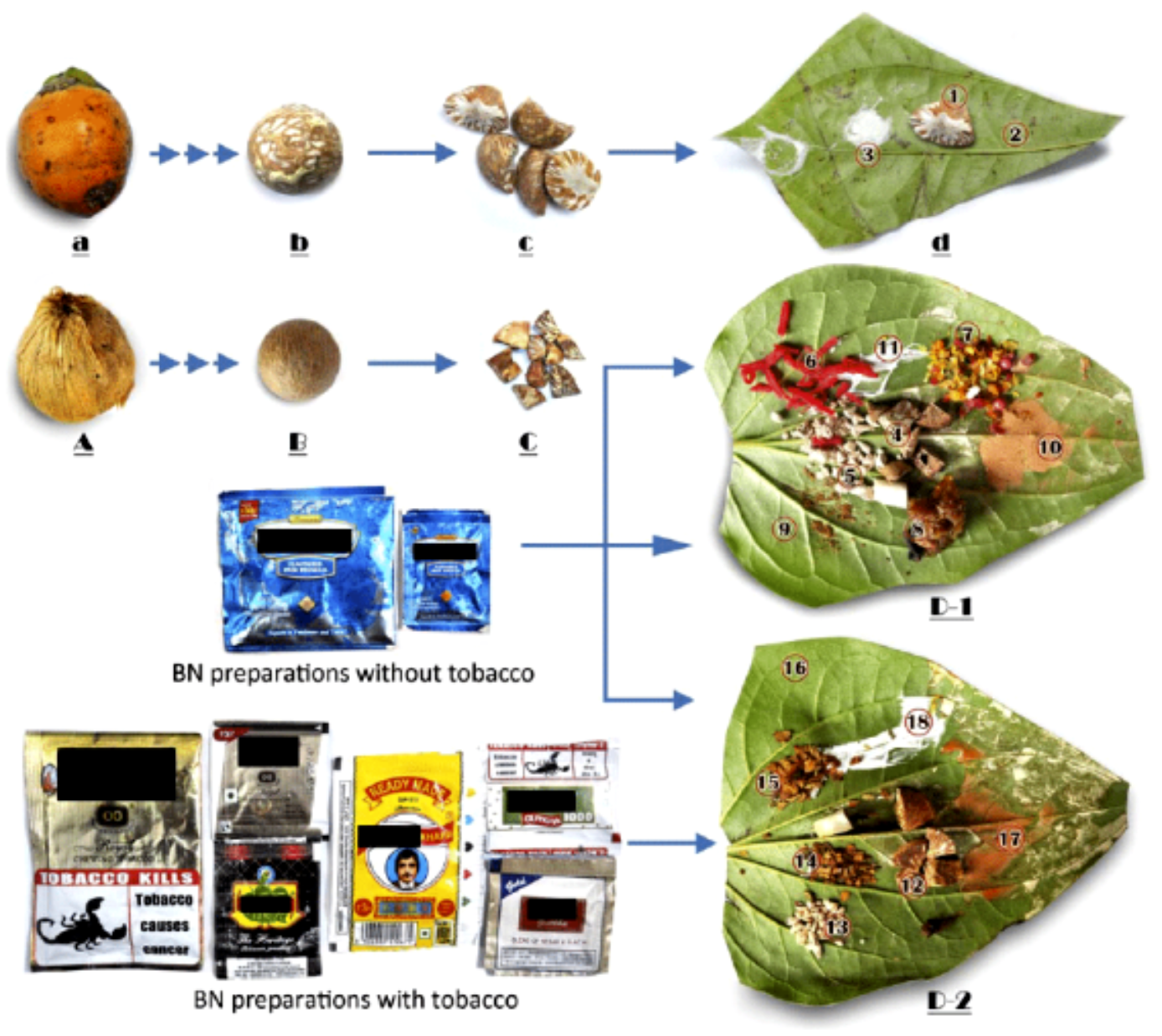 图1 印度槟榔果、槟榔嚼块(含烟草和不含烟草)制品[4]