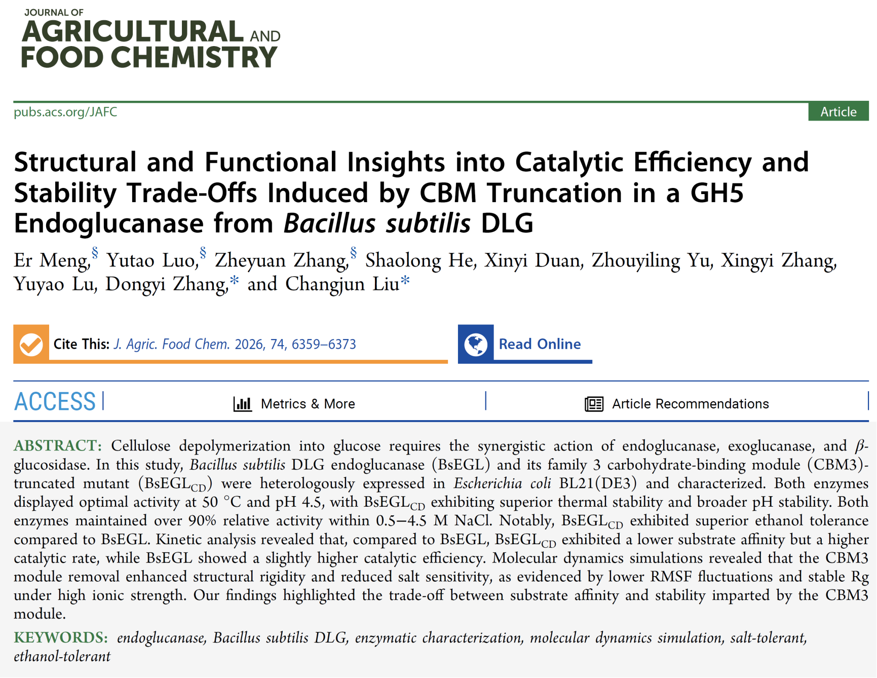 近日,湖南科技大学yl6809永利合成生物团队在纤维素酶分子改造研究方面取得新进展。团队成功解析了枯草芽孢杆菌Bacillus subtilis DLG的GH5内切葡聚糖酶及其CBM3结构域截短突变体的酶学特性与结构功能关系,揭示了碳水化合物结合模块在底物亲和力与构象稳定性之间的权衡调控机制。该成果已在农林科学领域顶级学术期刊《Journal of Agricultural and Food Chemistry》(中科院一区TOP期刊)发表。