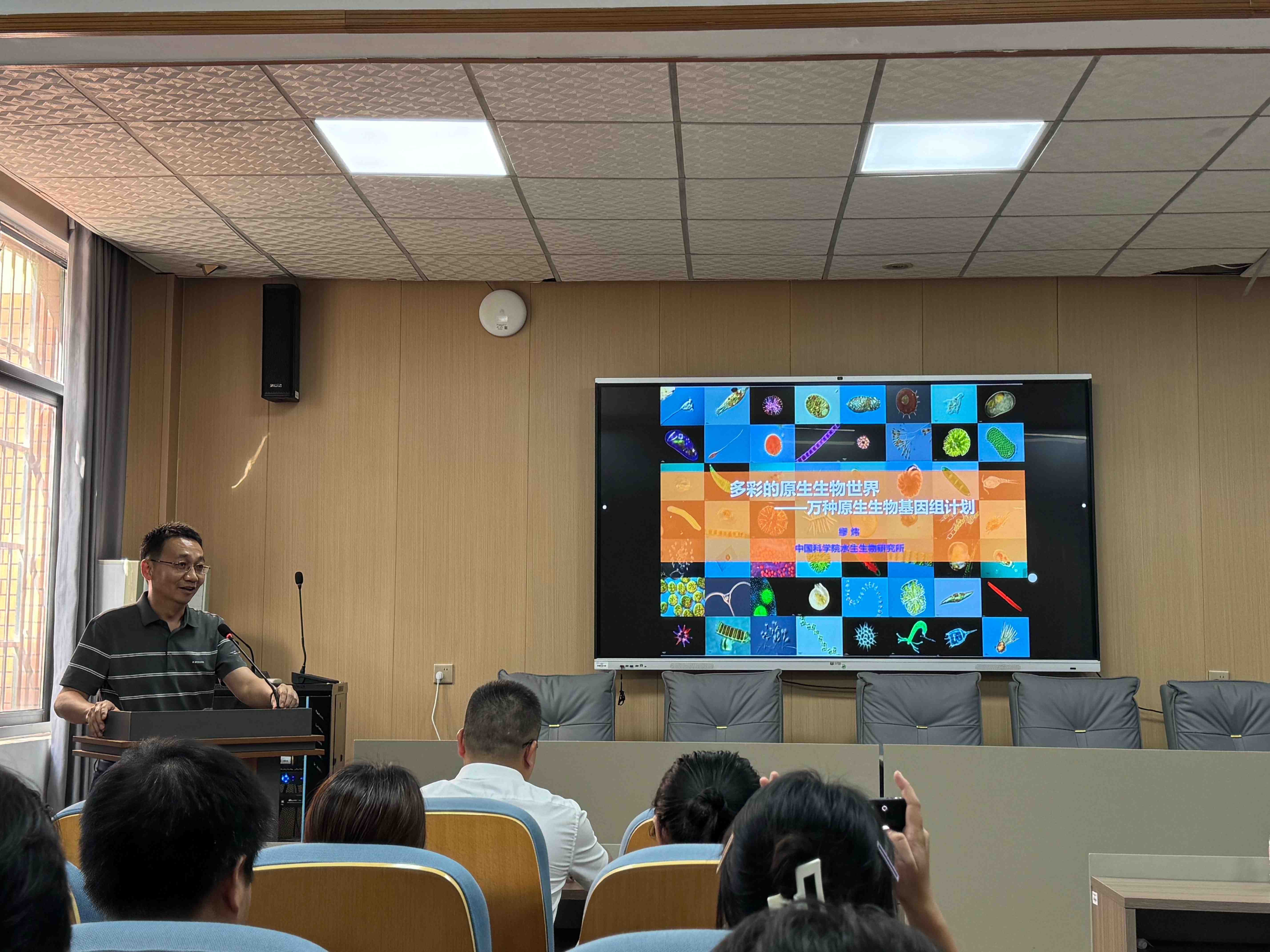 在生物楼105学术报告厅,缪炜所长为我院师生作了题为“多彩的原生生物世界——万种原生生物基因组计划”的专题学术报告。报告中,缪炜研究员从基础形态分类、单细胞测序到大规模组学数据分析和宏基因组数据挖掘等技术层面,系统介绍了其团队开发并创建的原生动物种质资源库和遗传资源库。基于这些资源,团队开展了涉及反刍动物瘤胃共生纤毛虫作用机制、原生动物新型细胞骨架及其快速运动的分子机理解析等重要领域的科学研究工作,为水生生物多样性监测、生态系统评价、环境污染物监测与降解、农业病虫害防治、生物饵料等生产实践应用提供了重要理论基础。报告内容前沿丰富,师生反响热烈。此次活动有效促进了我校与顶尖科研院所的学术对话,拓展了师生在微观生命世界探索中的视野。