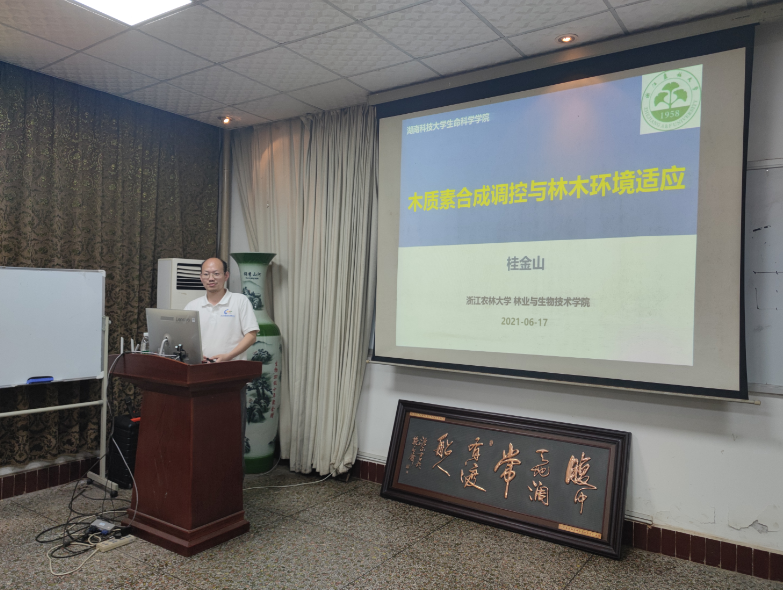 2021年6月17日学院邀请中国科学院分子植物科学卓越创新中心研究员、浙江农林大学教授、国家自然科学基金优秀青年基金获得者桂金山博士来我院讲学,并作题为“木质素合成调控与林木环境适应机制研究”的学术报告。我院部分教师与研究生参加了此次报告会,报告会由彭佳师博士主持。