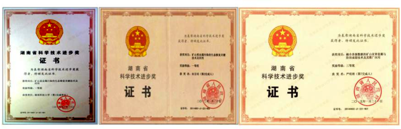 “矿山重金属污染的生态修复关键技术及应用”获2012年湖南省科学技术进步一等奖,“融合多源数据的矿山灾害监测与防治成套技术及其推广应用”获2015年湖南省科学技术进步三等奖,“油菜黄籽形成的分子机制研究与应用”获2017年湖南省自然科学奖一等奖。