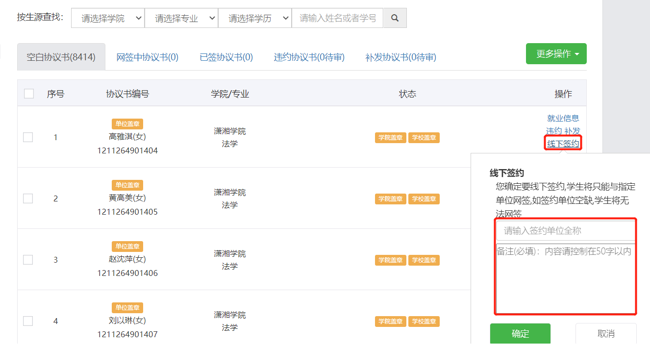 ④学生和用人单位还未明确签约意向,但是学生想去报名参加该单位的考试等选拔,同时单位要求上交空白的纸质协议书以获取报名资格(多见于报考公务员单位或者少部分国有企业及事业单位),可以向学院老师申请空白协议书(纸质),学院老师在发放空白协议书时,需在系统内做好标注。