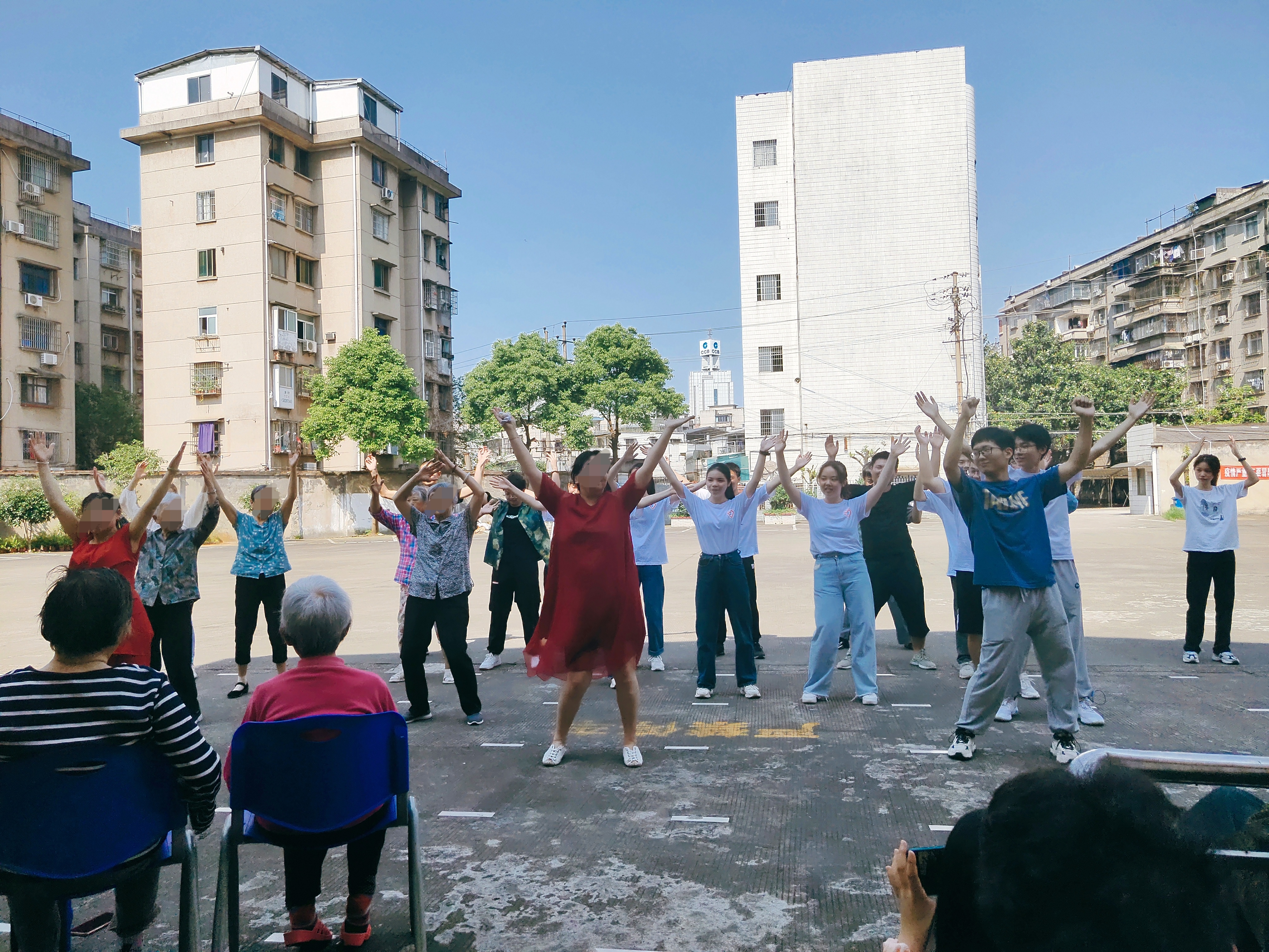 紧接着,我们给爷爷奶奶表演了节目,yl6809永利的志愿团给爷爷奶奶带来广场舞《最炫民族风》、合唱《倔强》,机电工程学院志愿团给爷爷奶奶带来《三句半》以及大家合作完成的合唱《明天会更好》《没有共产党就没有新中国》,并且我们还与爷爷奶奶一起跳起了广场舞,我们突然意识到,她们也不过是比我们大几十岁的小朋友呀,此时此刻,我们的心是在一起的,我们欢歌,我们起舞。