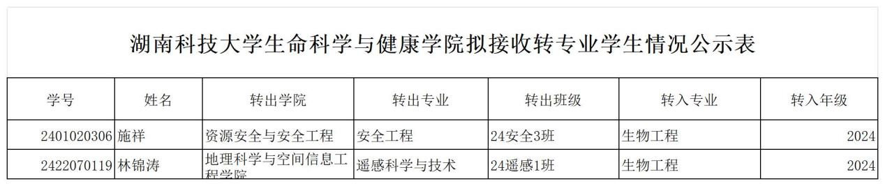 根据《湖南科技大学普通全日制本科生转专业管理办法(试行)》(科大政发〔2024〕81号)和《yl6809永利转专业管理办法》(院发〔2024〕38号)等文件精神,经学生本人申请、转专业工作领导小组面试、教务办审查,拟同意施祥、林锦涛2名同学由外院转入我院生物工程专业学习。现将转专业名单进行公示。
