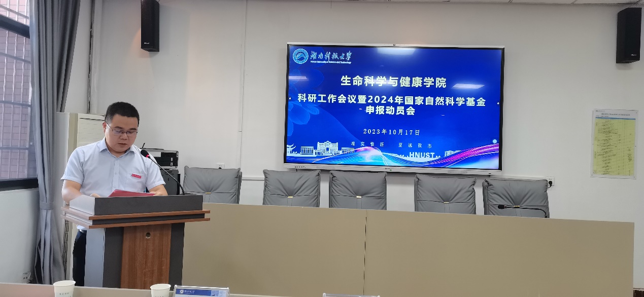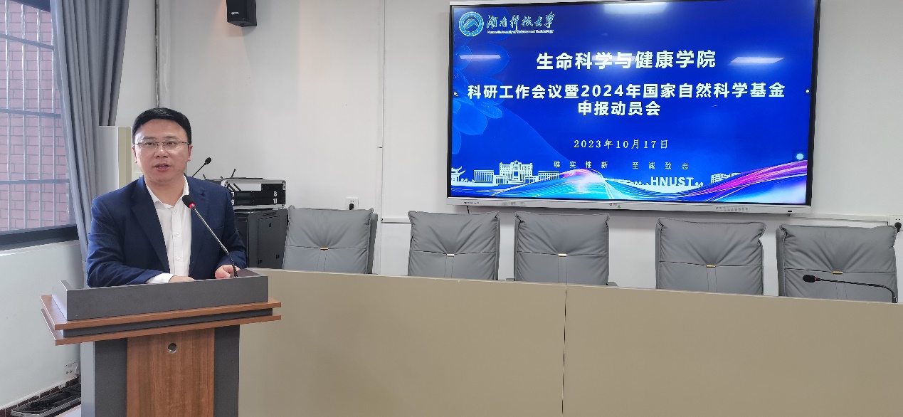 随后,郭时印书记在会上发表了动员讲话。他表示,一个学院的科研能力是学院的核心竞争力,是高质量发展的基础,也是每一位教学科研工作者安身立命之本。首先要高度重视科研工作,认识到目前科研工作的严峻形式和时不我待的局面,希望老师们能以此次会议为契机,重视科研,扎扎实实的做好科研;其次要主动破局,拒绝落后思想,拒绝守旧,拒绝封闭。要想在科研上有所突破就需要打破条条框框的束缚,破解内生动力不足的问题,树立包容、合作、共赢意识,增强探索科学世界的勇气和创新精神;最后要做好科学谋划,聚焦国家战略,围绕问题向导,提高谋划布局,强化有组织的科研。希望通过此次会议,我院科研人员能在科研思维、实验设计等准备过程中得到全方面的提升,顺利获批国自科项目。