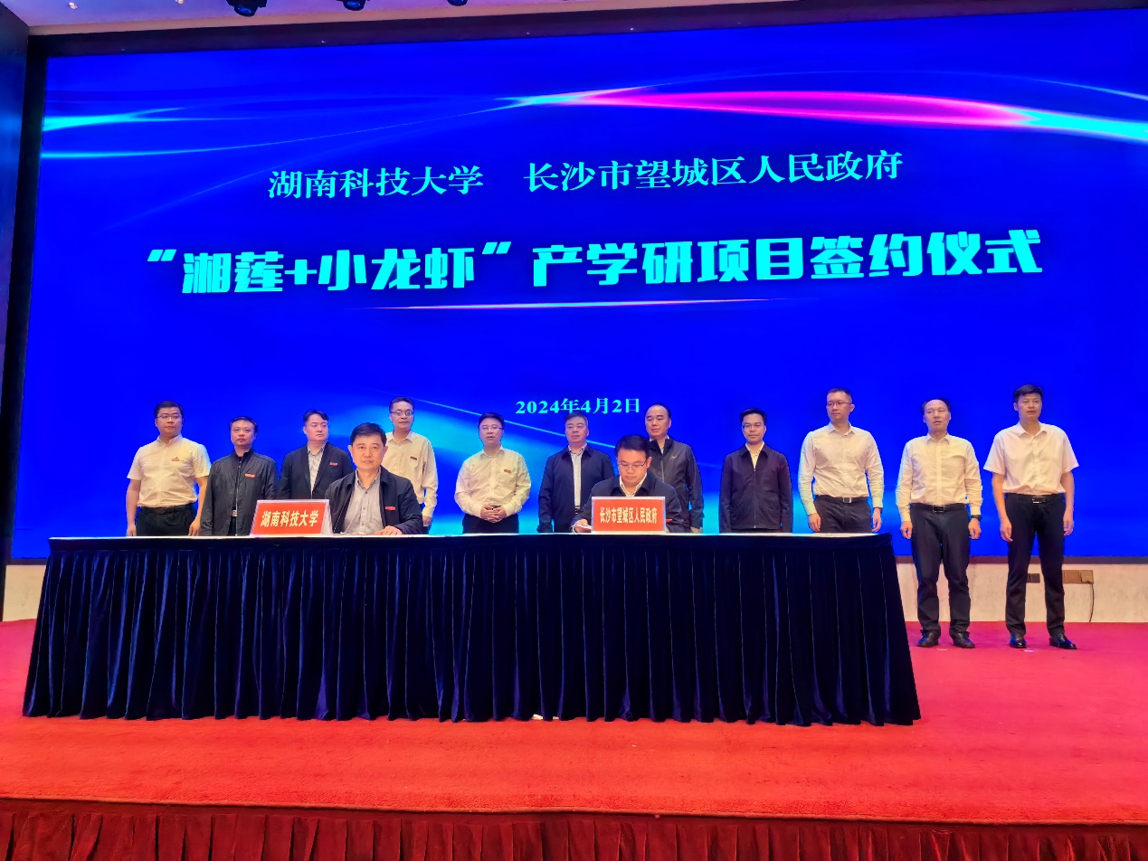 4月2日上午,我校与望城区人民政府举行“湘莲+小龙虾”产学研项目签约仪式。双方将携手推动望城荷花虾产业创新发展,促进农文旅深度融合,助力乡村振兴。湖南科技大学党委委员、纪委书记郭时印,望城区委书记秦国良出席并讲话。湖南科技大学党委委员、副校长王进代表学校与望城区签约。望城区委副书记、区长蔡锋,我校傅早霞、龙赢、余翰武等主要负责人出席签约活动。