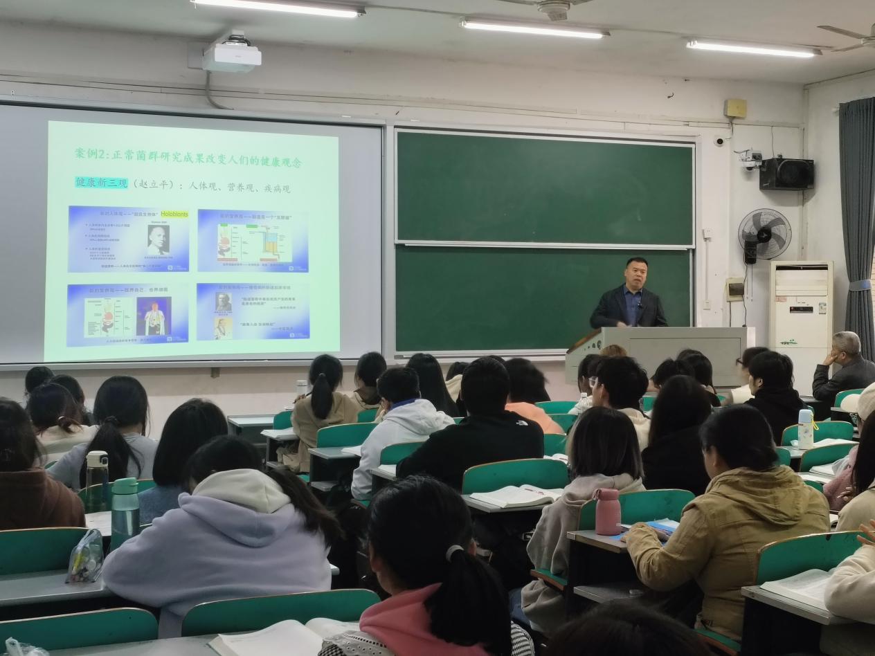 许爱清老师以“什么是正常菌群?”作为讨论的开端,讲解了人体正常菌群的生理作用,阐述了这些微生物在人体内的分布特性,以及在人体健康中所扮演的重要角色,并介绍了菌群失调症和防治方法。通过赵立平教授“减肥成果”登上了国际顶级科学期刊《SCIENCE》的案例,许老师向学生们展示了科学研究不仅需要坚持理想,更需要脚踏实地,亲身实践,才能取得突破性的成果。许老师还追溯了粪菌移植治疗人类疾病的历史渊源:古代中医的实践,此举不仅让学生们对菌群失调症有了更深入的了解,还唤起了他们对于中国传统中医文化的自豪感。学生纷纷表示:“尽管现代医学在不断发展,但古代中医的许多智慧仍然具有重要的现实意义和价值。”