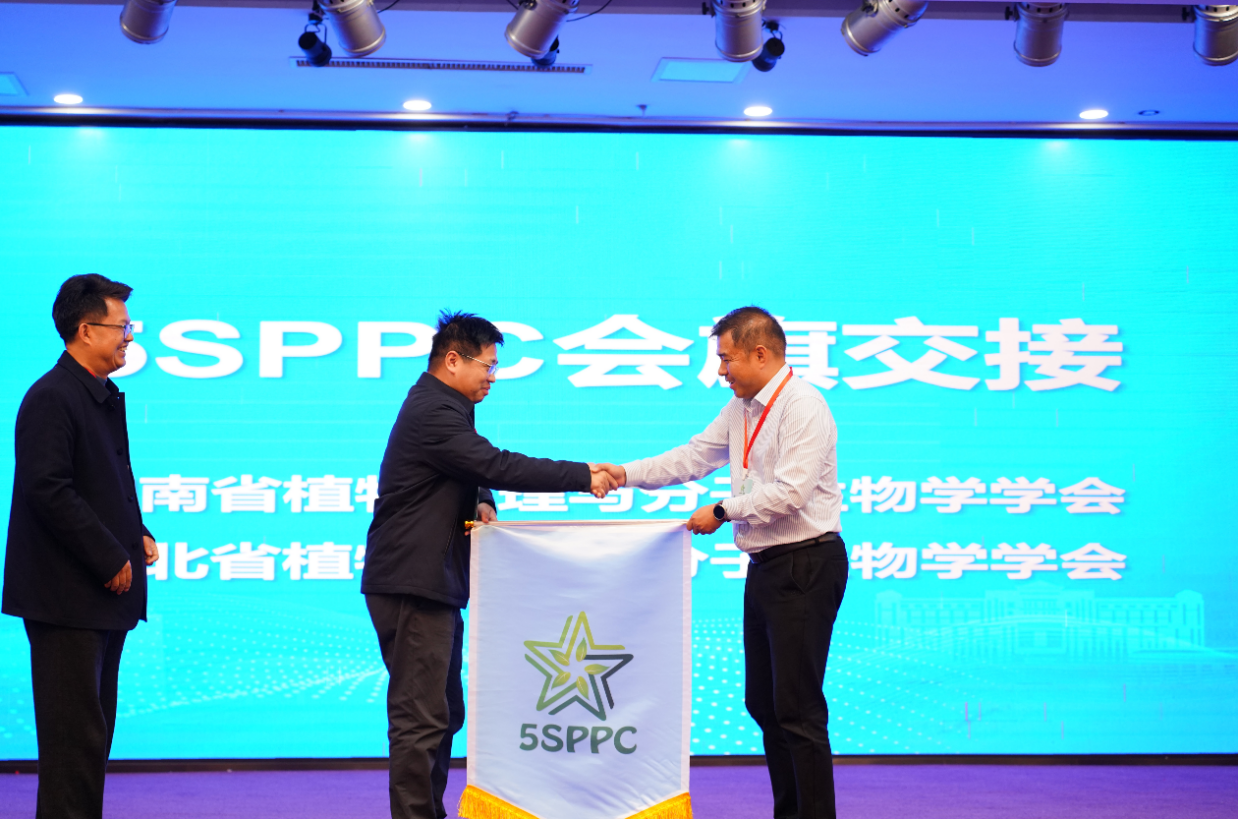 闭幕式最后,下一届会议承办方长江大学副校长许锋教授进行了“第七届中南五省植物生理学会联合学术年会(5SPPC 2026)”的预告。肖浪涛教授与蔡强教授分别代表湖南省植物生理与分子生物学学会和湖北省植物生理与分子生物学学会完成了5SPPC会旗的交接仪式。