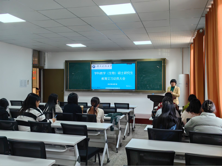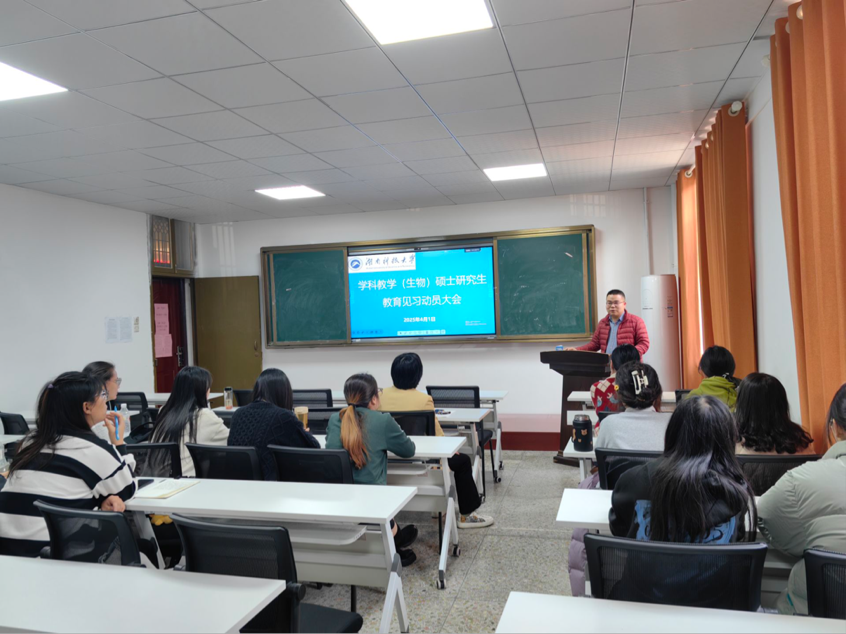 下午15:00,我院召开学科教学(生物)专业硕士研究生教育见习动员大会。学位点负责人彭喜旭教授详细部署见习任务,提出本次见习的目的、安排及其他注意事项。她强调指出同学们要认真学习一线教师的教学模式和提问技巧,并认真总结见习过程中的经验与成果。