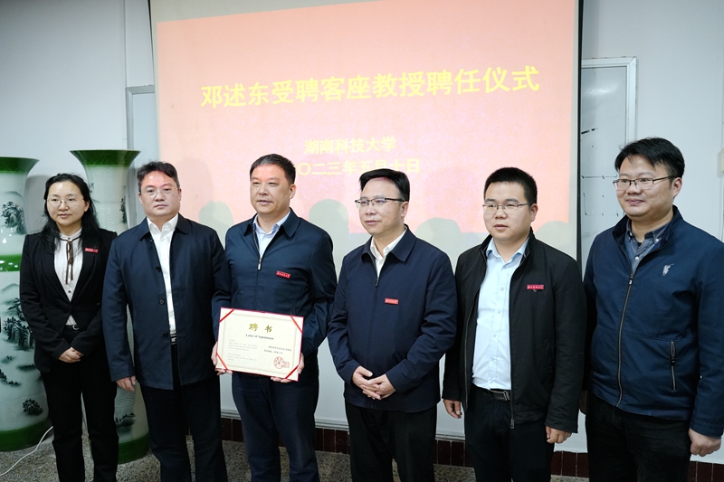 聘任仪式在yl6809永利生物楼105会议室举行,由湖南科技大学校纪委书记郭时印为邓述东颁发聘书,佩戴校徽,真诚欢迎他的加入。期待双方能在重大课题研究、农业和粮食生产、科技创新等多个领域开展合作,努力促进学校的师资队伍建设,大力提升学生的创新精神和实践能力,推动学校的高质量发展。