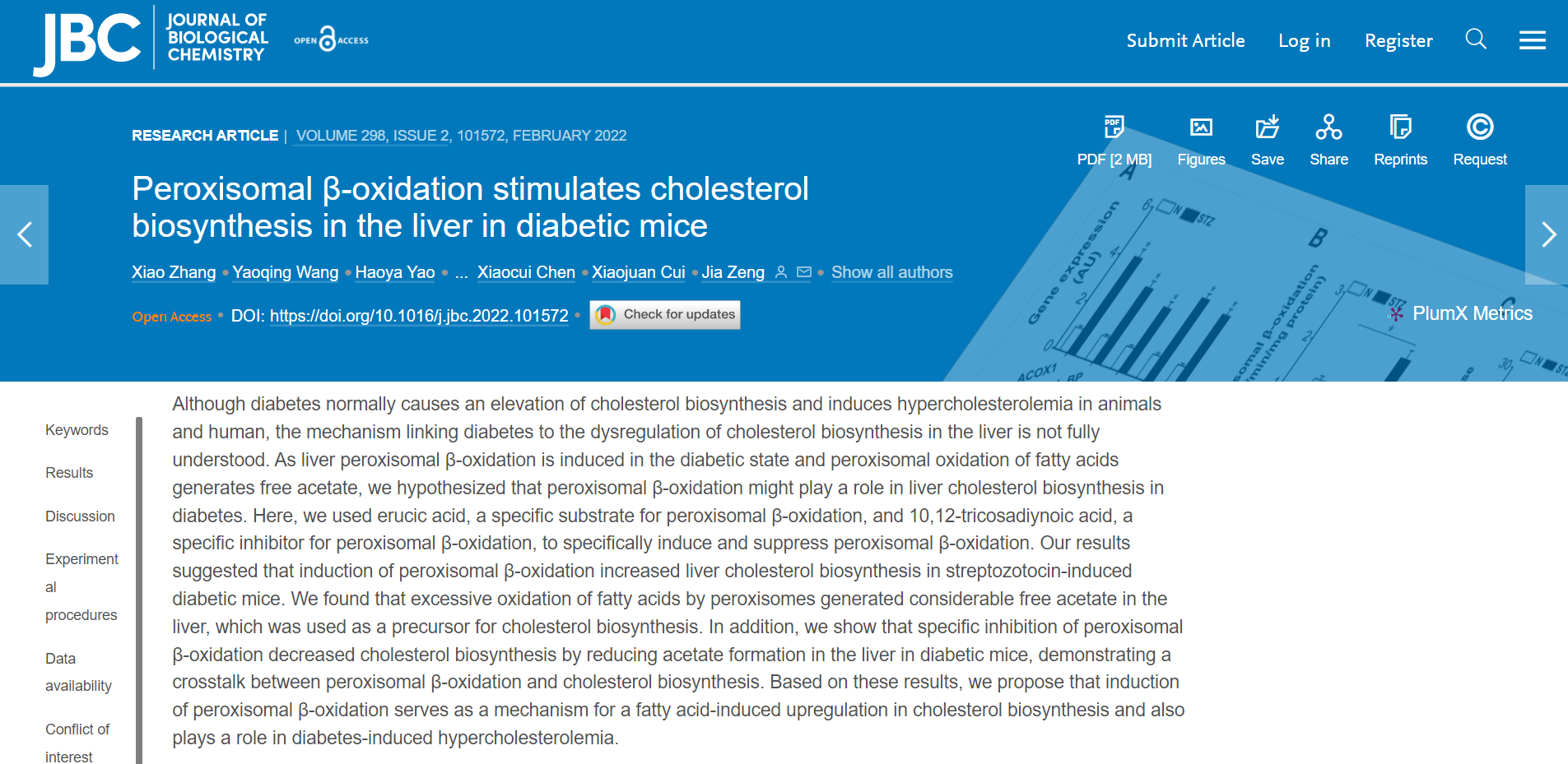 曾嘉教授课题组长期从事脂肪酸氧化与代谢疾病关联机制研究,在过氧化物酶体脂肪酸氧化与非酒精性脂肪肝病、肥胖、胰岛素抵抗、高血脂症、糖尿病肾病等代谢疾病的关联分子机制方面取得了一系列原创性研究成果,这些研究为全面揭示脂肪酸代谢异常引发各种代谢疾病的核心机制提供了重要的机制创新,也为开发治疗各类代谢疾病的创新药物提供了极具前景的治疗靶点。