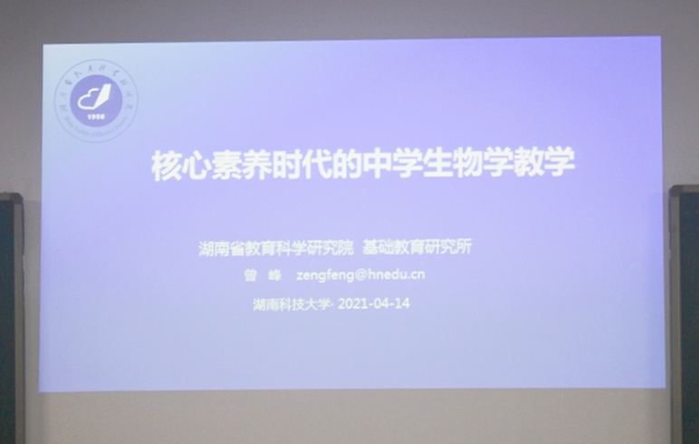 4月14日下午,湖南省教育科学研究院基础教育研究所中学生物学学科教研员,高中教育研究室主任曾峰应邀来校做主题为“核心素养时代的中学生物学教学”的讲座。yl6809永利党委书记严明理、副院长孙远东、周定港、生物科学系系主任张大为及教师代表易俗、彭喜旭等老师到场参加。17级、18级生物科学专业本科生,20级学科教学(生物)研究生近200余人参加讲座。讲座由副院长周定港主持。